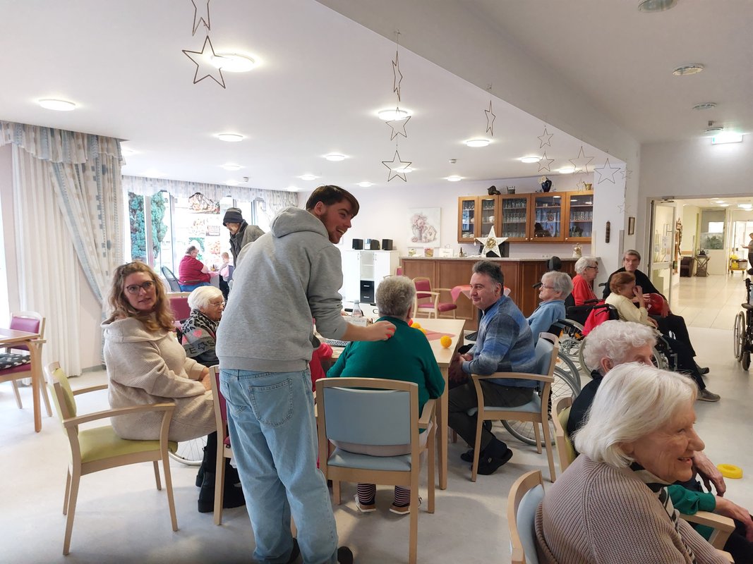 Heute hat uns der Wichern Kindergarten aus der Nachbarschaft besucht. Mit wildem positiven “Gewusel” wurde der große Speisesaal zu einem Ort der Begegnung von Jung und Alt. Die Kinder des Kindergarten und auch die Bewohner des Erich Wandel Zentrums trafen zunächst ein wenig schüchtern aufeinander. Aber die Anfängliche Skepsis verflog schnell und ein gutes Miteinander entstand.