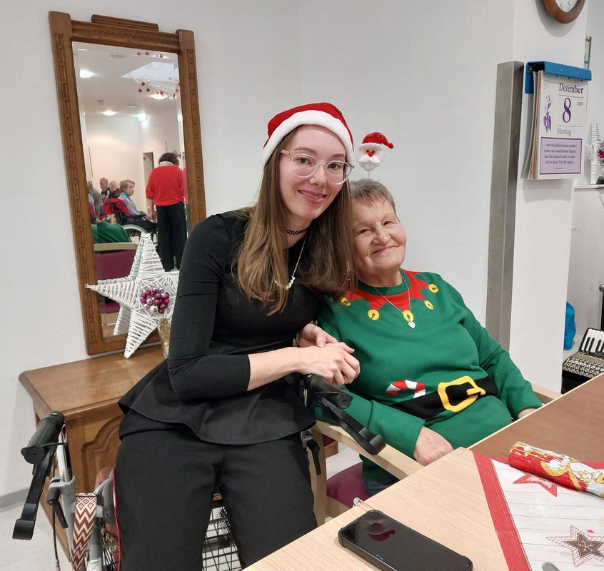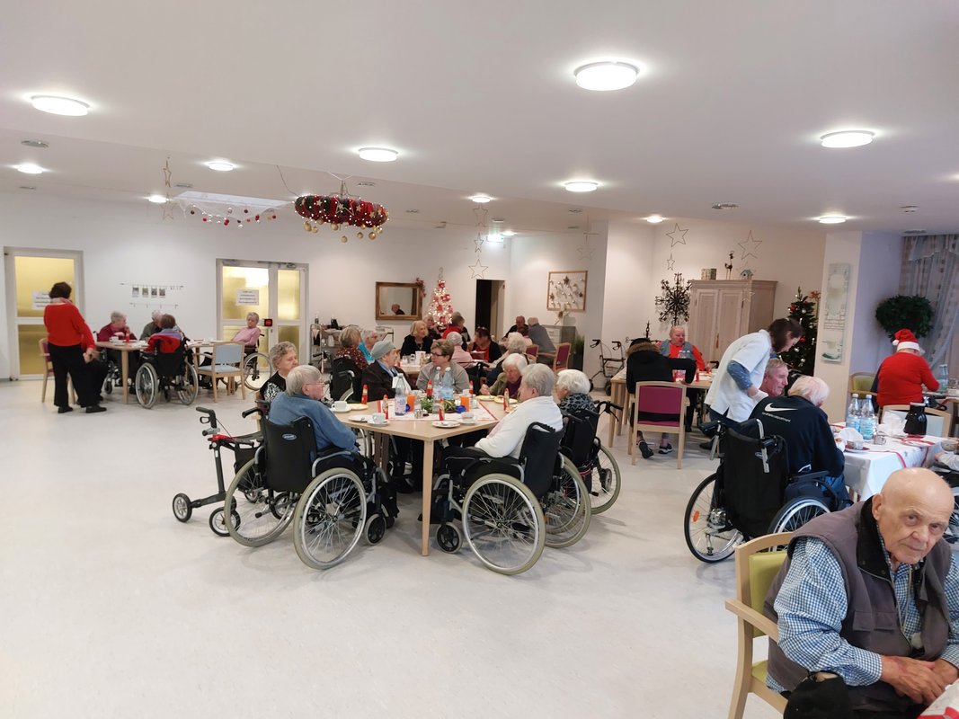 In gemütlicher Atmosphäre wurde im großen Speisesaal zunächst Kaffee getrunken und Waffeln gegessen. Die Geburtstagskinder des Vormonats wurden gefeiert und bejubelt. Der Nikolaus erschien mit Unterstützung und überreichte jedem Bewohner*in eine Schokoladen Nikolaus bevor er seinen Weg durch die Zimmer fortsetzte.