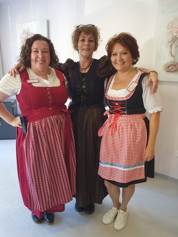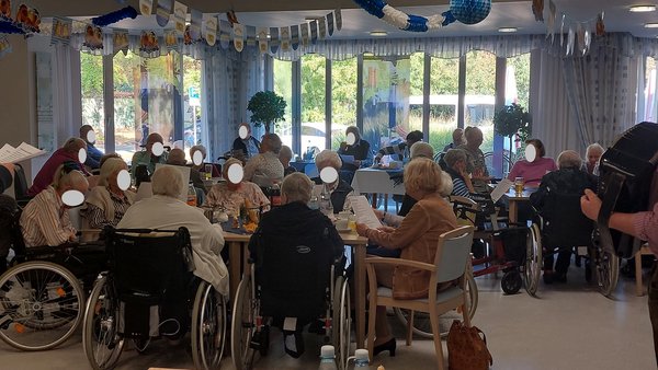 Im festlich geschmückten Saal wurden die Bewohner von den Mitarbeitern in Tracht begrüßt und den ganzen Nachmittag über versorgt und betreut. Gestartet wurde mit einem klassischen Kaffeetrinken mit Waffen, heißen Kirchen und Sahne, bevor dann Knabbereien und ein zünftiges Weißbier auf den Tisch kamen.