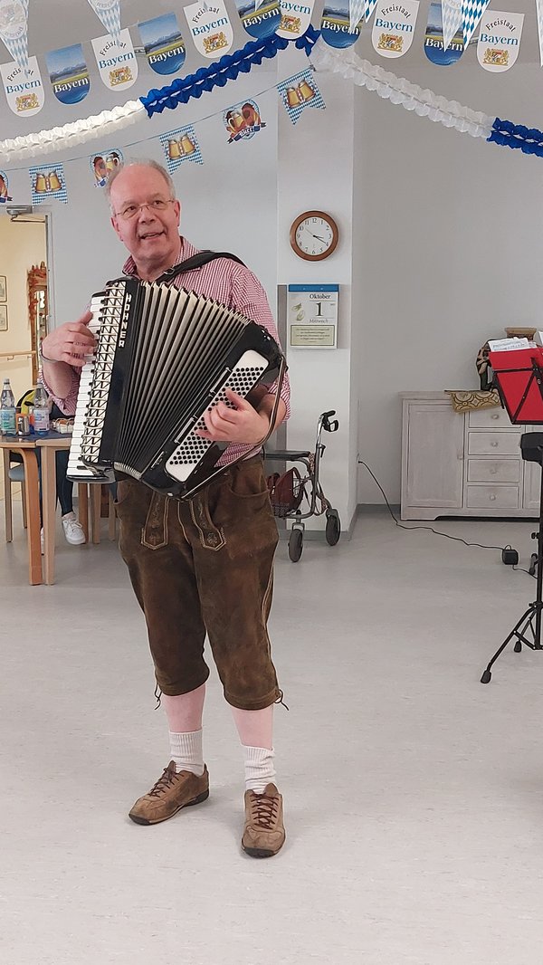 Georg Steffens hatte zum heutigen Festtag nicht nur die passende Musik zum mitsingen und schunkeln dabei, sondern ebenfalls wie Herr Adams vom sozialen Dienst, seine Lederhose.